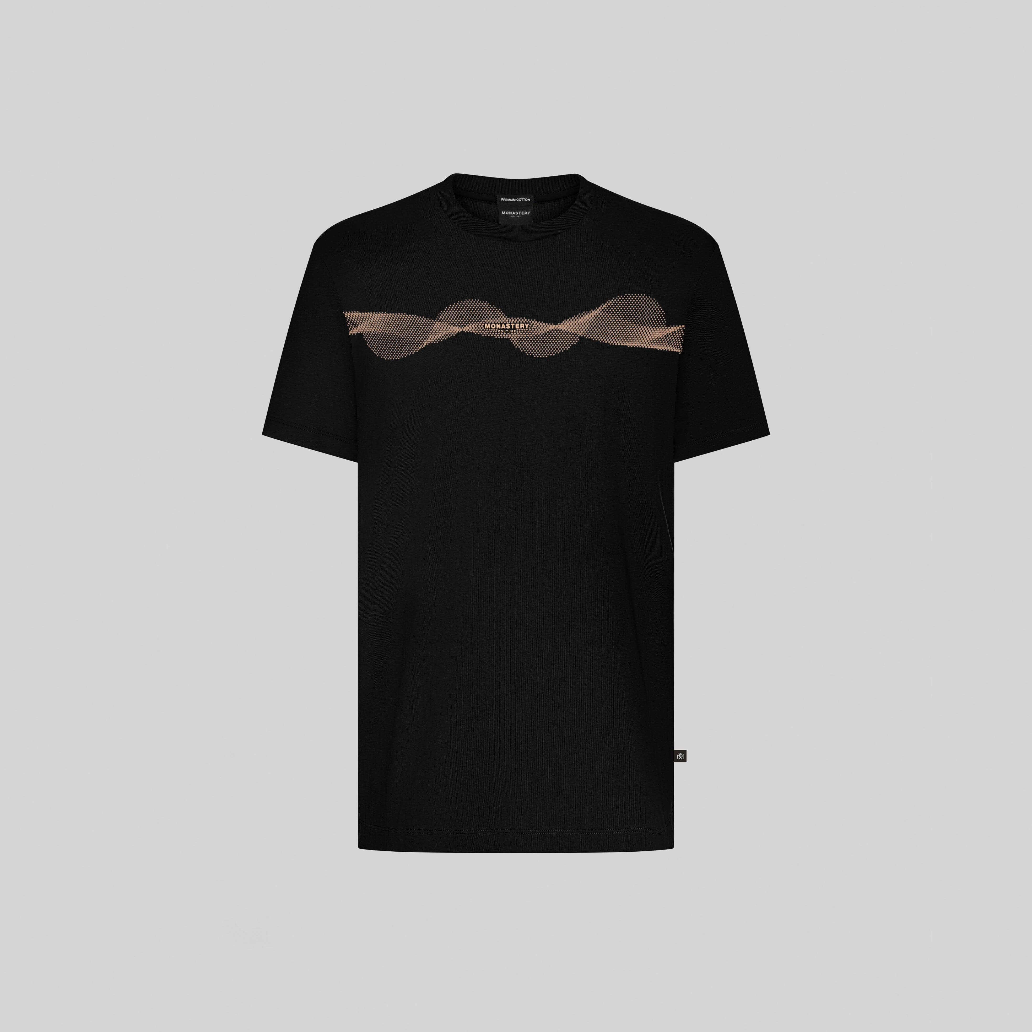 Nuestra camiseta de hombre Baikal, en algodón Pima peruano. Está confeccionado en silueta regular, en el frente lleva una placa metálica contra amarga Monasterio enmarcada en un arte en ondas dinámicas estampadas sobre flocado representativo de la colección Odyssey.